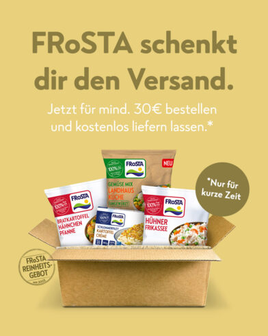 Ab 30 € Einkaufswert schenken wir dir die Versandkosten. Jetzt Lieblingsprodukte bestellen und sparen: Ob Hühner Frikassee, Tortellini Tomaten-Sahne, Gemüsemixe oder knusprigen Fisch. Wähle deine FRoSTA-Favorites und wir übernehmen den Standardversand von 6,90€. Nur für kurze Zeit – also schnell zugreifen!