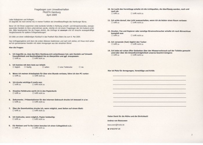 Dies ist der Fragebogen, den 75% der Kollegen unseres Hamburger Büros fleißig bearbeitet und an mich zurück gegeben haben. Wir wollen nämlich, wie berichtet, unser Büro umweltfreundlicher und nachhaltiger betreiben. 94 % der Hamburger Kollegen begrüßen die Aktion übrigens, so kann man arbeiten!